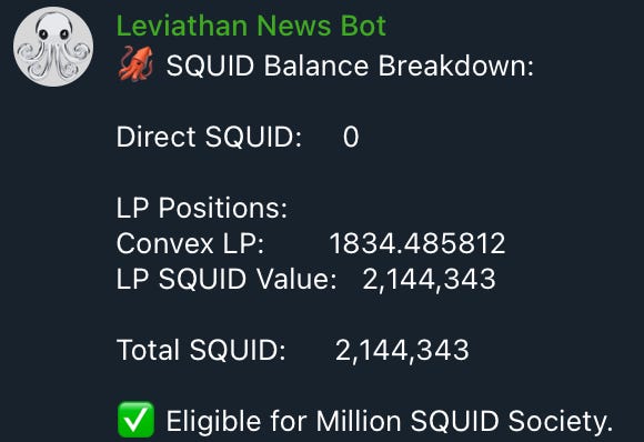 To further facilitate networking and governance discussion, we’ve also launched a token-gated Telegram group available to everybody who has over 1 million SQUID (or equivalent, based on spot LP value).