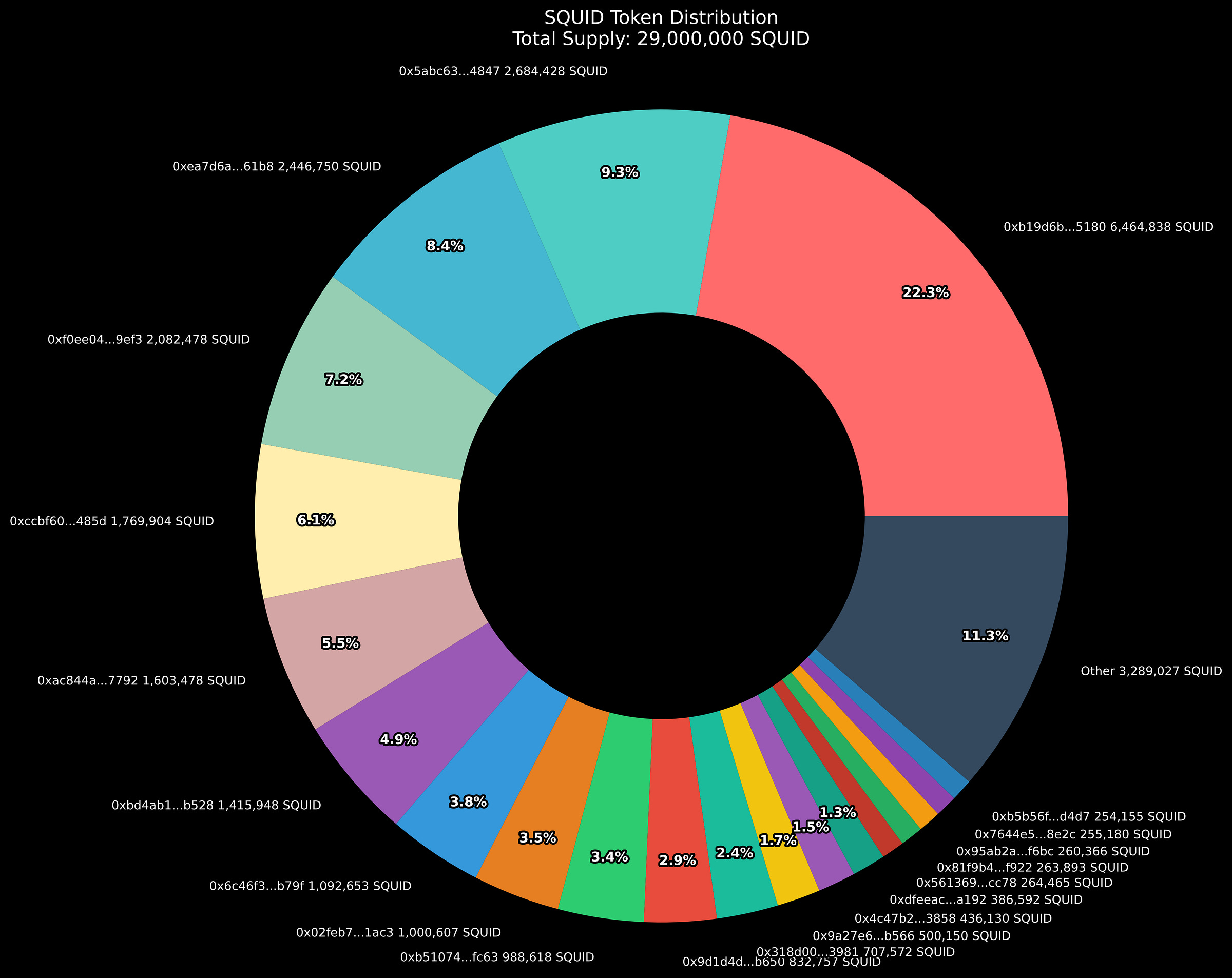 The SQUID DAO is among the more truly democratic of governance entities, with no single address holding over 25% of the voting power at present, and 6 addresses minimum required to gain a majority.