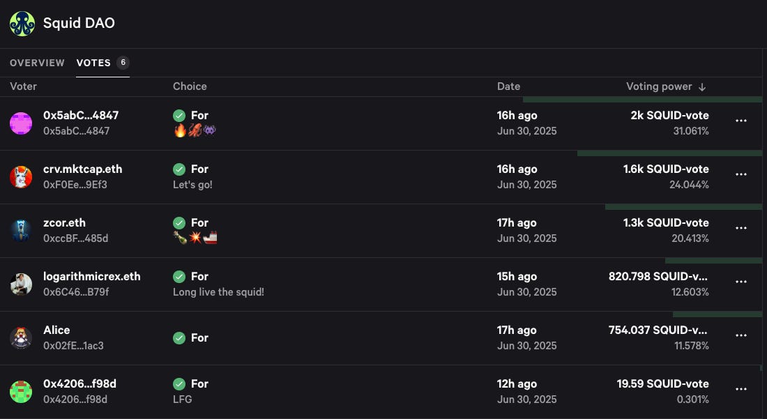 To simplify the calculations, voting power is denominated by LP price, not SQUID price. So 25000 SQUID would represent ~20 SQUID-votes at current prices.