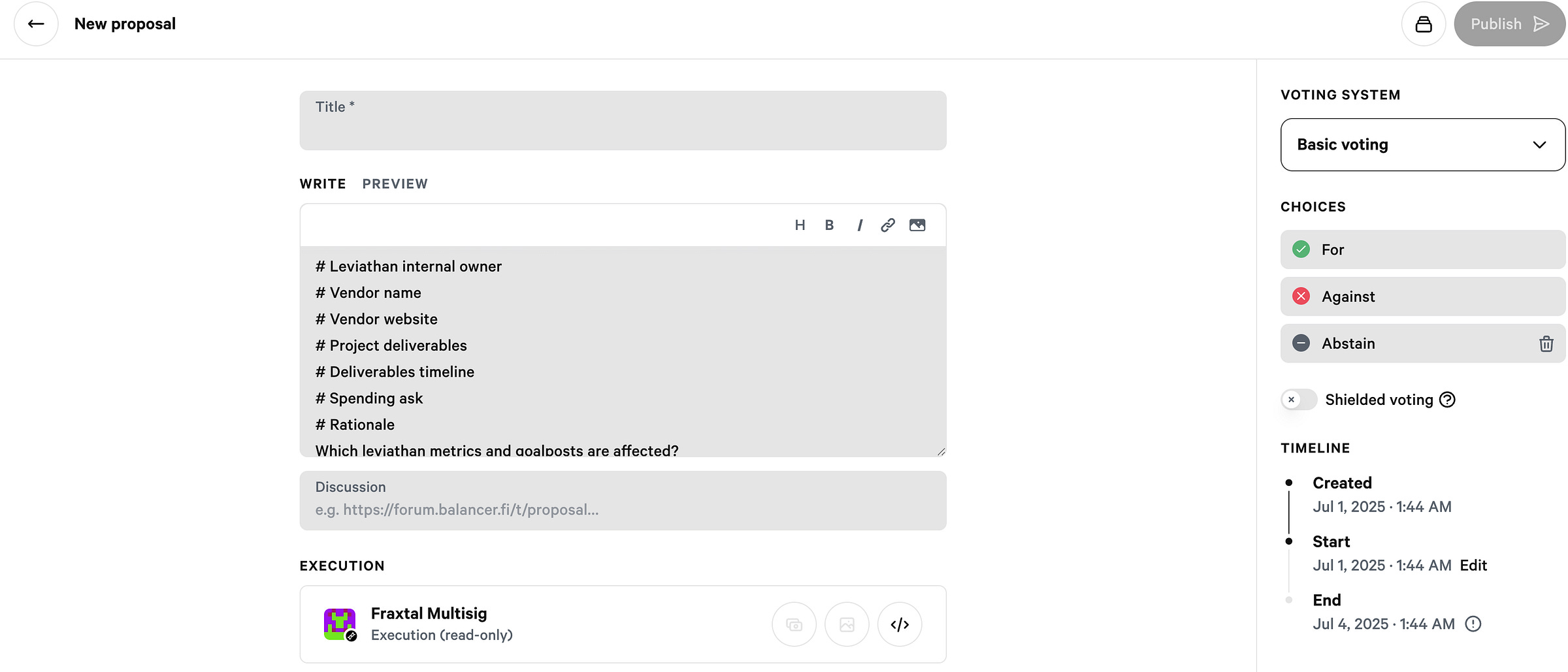 Our default template to propose minting or spending funds from the DAO utilizes the following format: